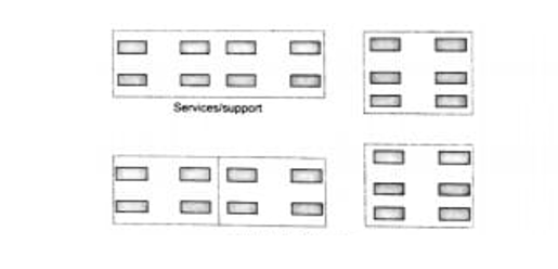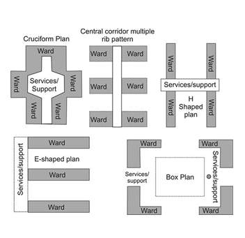 In patient areas horizontally in single or two storey buildings linked by horizontal corridors. This arrangement has got advantages. It facilitates growth and reduces or eliminates the requirement for expensive vertical transportation system, particularly lifts. It is suitable for small size inpatients up to 300 bed strength.