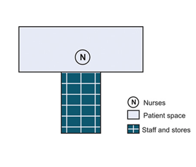 The modified nightingale ward has got the nursing station in the centre of the ward, the ancillary, auxiliary services are provided at one end and the utility services at another end. The nurse’s travel time has been reduced and the supervision over the patient’s condition also improved in the modified pattern of ward.