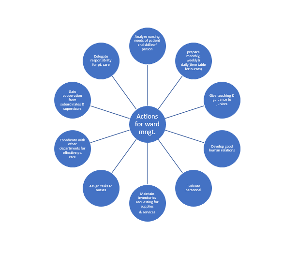 Management defined in a simple language is to get the work done in a systematic way for accomplishment of defined objectives based on management of Men, Money and Materials, Machines, Methods and Minutes. Management gives us the clue as to how to get best possible services and how to make the ward administration effective and efficient. It is also said that management is a process by which a cooperative group directs action towards common goals. Ward management is facilitated by the development of systematic procedures for dealing with the details of ward functions by adoption of a system of day-to day tasks. The ward management is basically an operational management. The ward management is the key to success of the hospital. The image of a hospital depends to a large extent upon the patient’s satisfaction. The patient’s satisfaction is dependent upon the effective and efficient ward management. The effective ward management depends upon the technical skills and ability of the ward sister. Another important fact about the ward management is, ward is a matrix organization, a very complex organization. It is to be managed on the principles of a project management. The ward sister is under the dual command, at one hand she is under the command of the physician in-charge of the ward/department at other hand she is under the command of nursing superintendent. This makes management of the ward a very challenging job. While managing a ward, the manager has to apply various managerial skills which differ as per the level of the management. The student is advised to consult the introductory chapter on management in the same book. The nurse manager has to apply the whole management process while managing the ward/unit and to follow all the management principles.