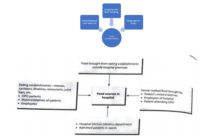 Food safety in hospital is a daily challenge. Large volumes of food are prepared/brought in by contractors, kept warm at safe temperatures, distributed though long corridors and served to a large number of patients by many hands. Food contamination can occur at any point from its journey to procurement of raw material to it being served to the client. Unhygienic raw material can make the food unsafe by cross contamination with cooked food or during inadequate cooking. Improper handling of food permits contamination, existence and growth of infectious organisms. The common errors in food handling are contamination by food handlers during transportation and/or serving of food through unclean utensils. Improper storage (storing food at room temperature) or inadequate refrigeration, inadequate reheating can also lead to food contamination. This will depend on the source of food. Though desirable as of now, hospitals can do little to monitor or control the quality of food brought in the hospital by patients, relatives or employees.