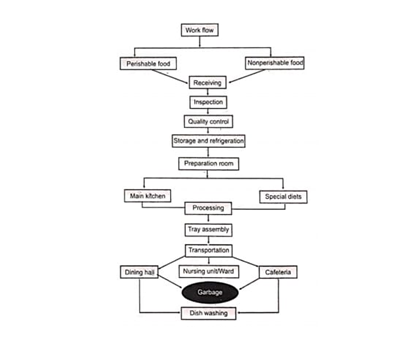 Procedures include checking delivered materials as to correct quantity, and package condition; checking scales accuracy; correct storage of different foods; opening cans, and other containers; weighing ingredients; boiling rice, vegetables meat and other food materials; and preparing various food items and special diets. They include carving meat; assembling patients’ meal trays; transporting meals to wards; storing unused cooked food; washing and sanitizing equipment; washing and sanitizing floors; evaluating and controlling plate-waste.